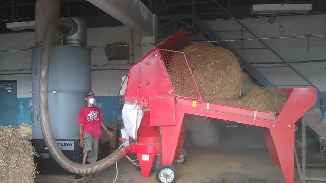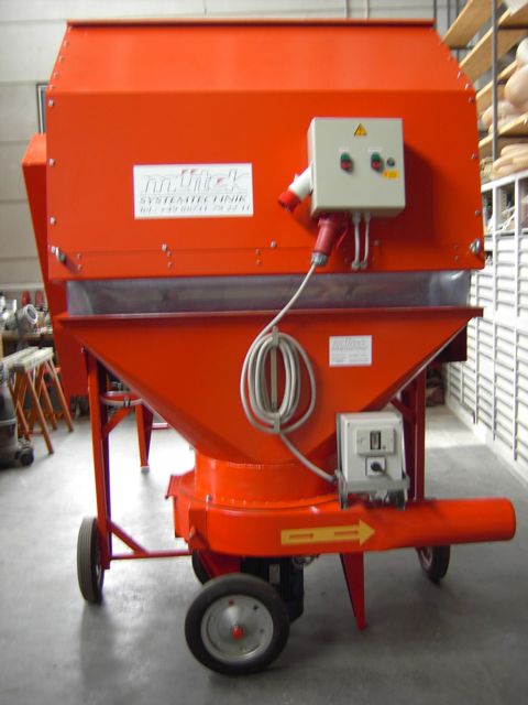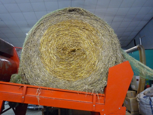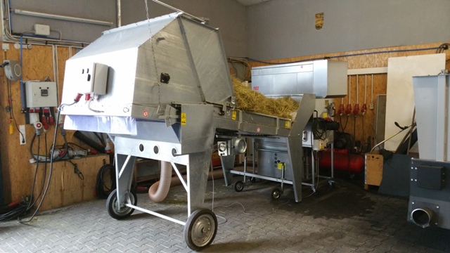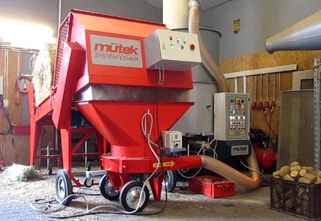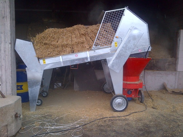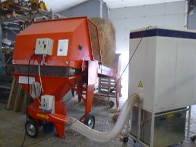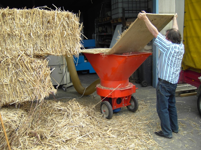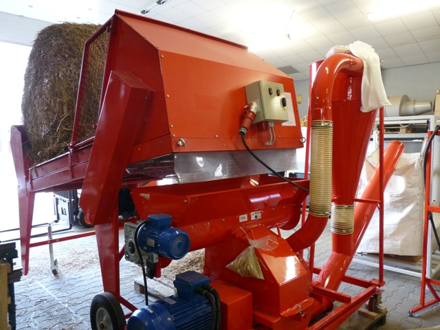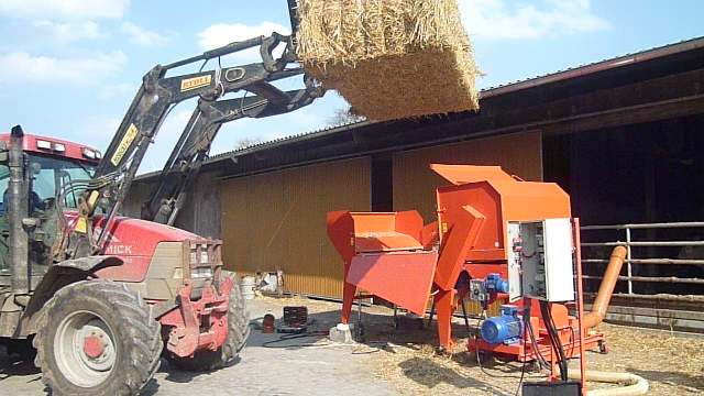 On the baleopener there is a chain conveyor (Motor: 0,75 kW, adjustable pace) installed, which pushes the bale against the milling rotor (Motor: 5,5 kW). Several grinders which are placed on the milling rotor tear up the straw bale and make the straw fall down into the hopper of the strawmill Type MHZ 600 or MHZ 800. The strawmill processes the slightly dissolved straw into short straw. Depending on the installed screen (8 – 45 mm) the straw gets more or less crushed down. The assembled ventilator blows the short straw up to 12 meters by air. Both machine types can also be used as stand-alone machine. Only dry material can be processed (humidity max: 20 % Atro). Bales out of silage are not supposed to be used. The performance of the system is between 250 and 900 kg/h – depending on the material and the fitted screen size. Each machine has a separate panel board.
