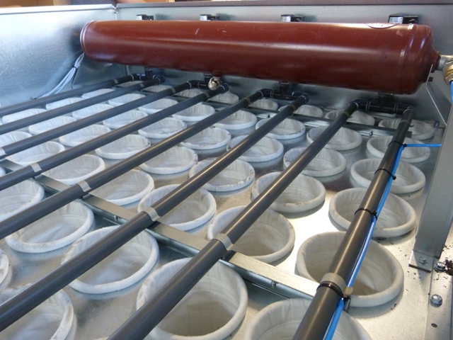 The dust extractors are designed for the extraction of individual machines with suction hose or for the extraction of several machines with a pipeline system. The extractors impress with their compact design. The residual dust content in the return air is below 0.1 mg / m³ for the MMJet dedusting devices. The patented, automatic, differential pressure-controlled cleaning of the filter hoses ensures continuous operation. Each individual filter hose is cleaned intensively from the inside to the outside with the help of a compressed air impulse. The particles are repelled from the filter surface and fall freely into the disposal station.