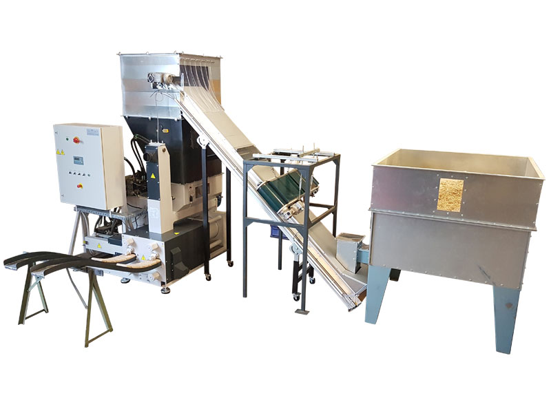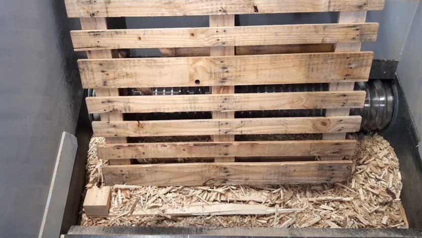Shredding of waste wood and pallets for the production of high-density briquettes.